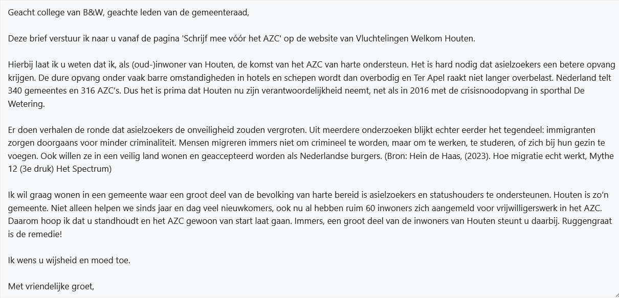 Houten laat zien: vluchtelingen zijn hier welkom! Op 17 oktober 2025 is de brievenactie “Schrijf mee vóór het AZC!” gelanceerd door Vluchtelingen Welkom Houten (VWH). Met deze actie kunnen inwoners van Houten via de website een brief sturen aan het college van B&W en de gemeenteraad. VWH steunt de komst van het AZC omdat asielzoekers … Lees verder
