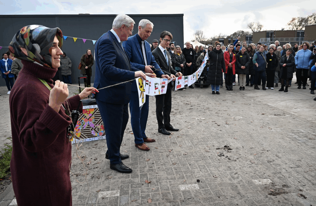 ‘We woonden hier rustig’, zegt ze over de weilanden die tot de komst van het azc aan vier kanten van haar huis uitzicht boden. Nu ligt er aan de voorkant een zandwal om het geluid te dempen en de gebouwen, dieselgeneratoren en gigantische accu’s aan haar zicht te onttrekken. ‘Onze vrijheid is weg. Het gaat ook om hoe dit er doorheen is gedrukt. Daarom is mijn man er niet vandaag; te moeilijk voor hem.’ Wethouder Jan Uitslag begrijpt het. ‘Je woont hier rustig, redelijk vrij, en ineens staat er in een halfjaar tijd een woonlocatie naast de deur waar 190 mensen een plek krijgen. Dat is niet niks. Daarom hebben we vanaf het begin gezegd: we willen dit samen met de buurt doen.’ Als tegemoetkoming kwam de zandwal rond het azc en ook hebben de gebouwen niet drie, maar twee woonlagen. Maar de wethouder weet ook: ‘Hoe zorgvuldig je ook bent, je kunt niet iedereen tevreden stellen. Dat is de realiteit.’ Ondanks haar weerzin is de ontevreden buurvrouw toch komen kijken bij de opening. Ze ziet hoe de bestuurders een lint met tekeningen van bewoners te hand nemen voor de openingsceremonie. En ze klapt mee als Iraniër Mehdi namens de nieuwe bewoners iedereen bedankt.